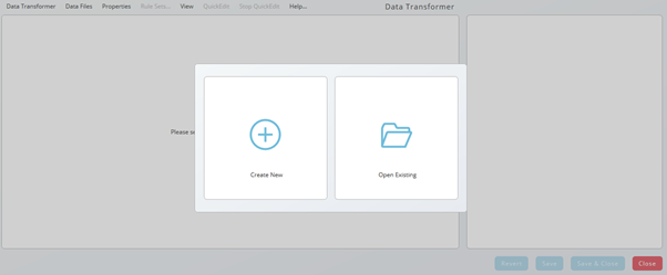 On starting the Data Transformer, a popup appears allowing to open existing data transforming definitions or to create a new one. Creating a new Data Transformer will end up in a Data Transformer object, a definition which can be re-used in different processes.